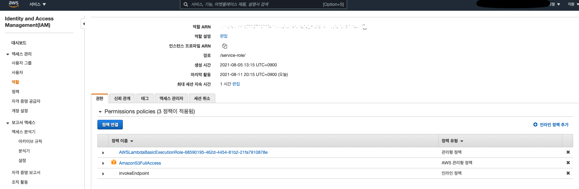 위 에러를 해결하기위해 인라인 정책추가에서 sagemaker 서비스의 invoke_endpoint를 허용해주었다!
