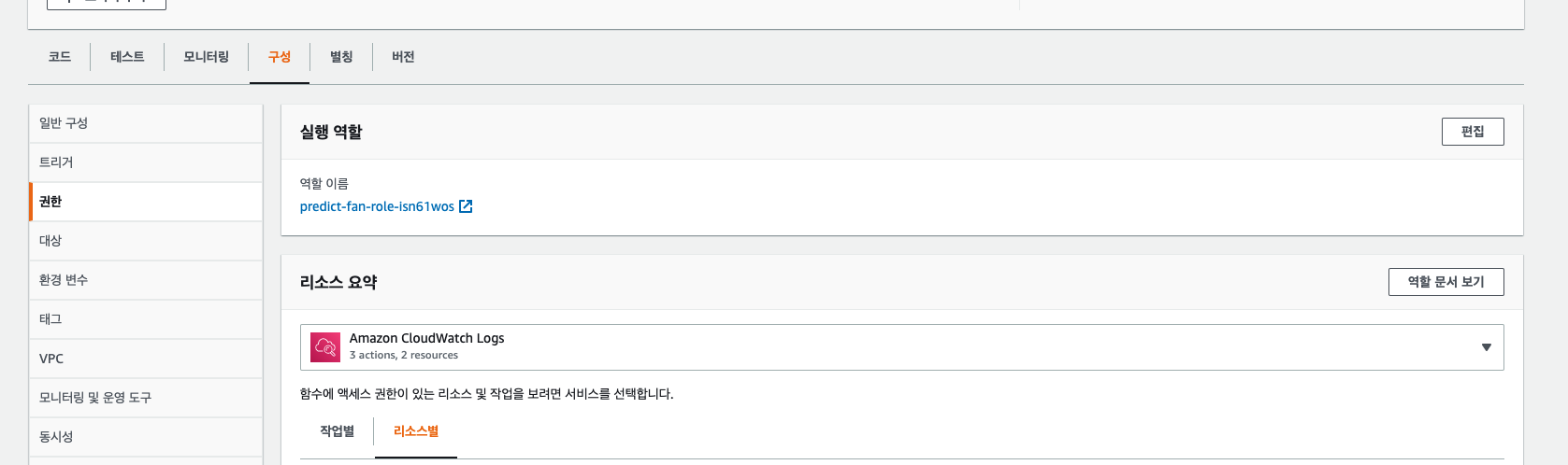 Lambda 함수 내 구성>권한 에서 실행역할을 클릭하여 IAM 콘솔창에서 정책을 추가해준다.