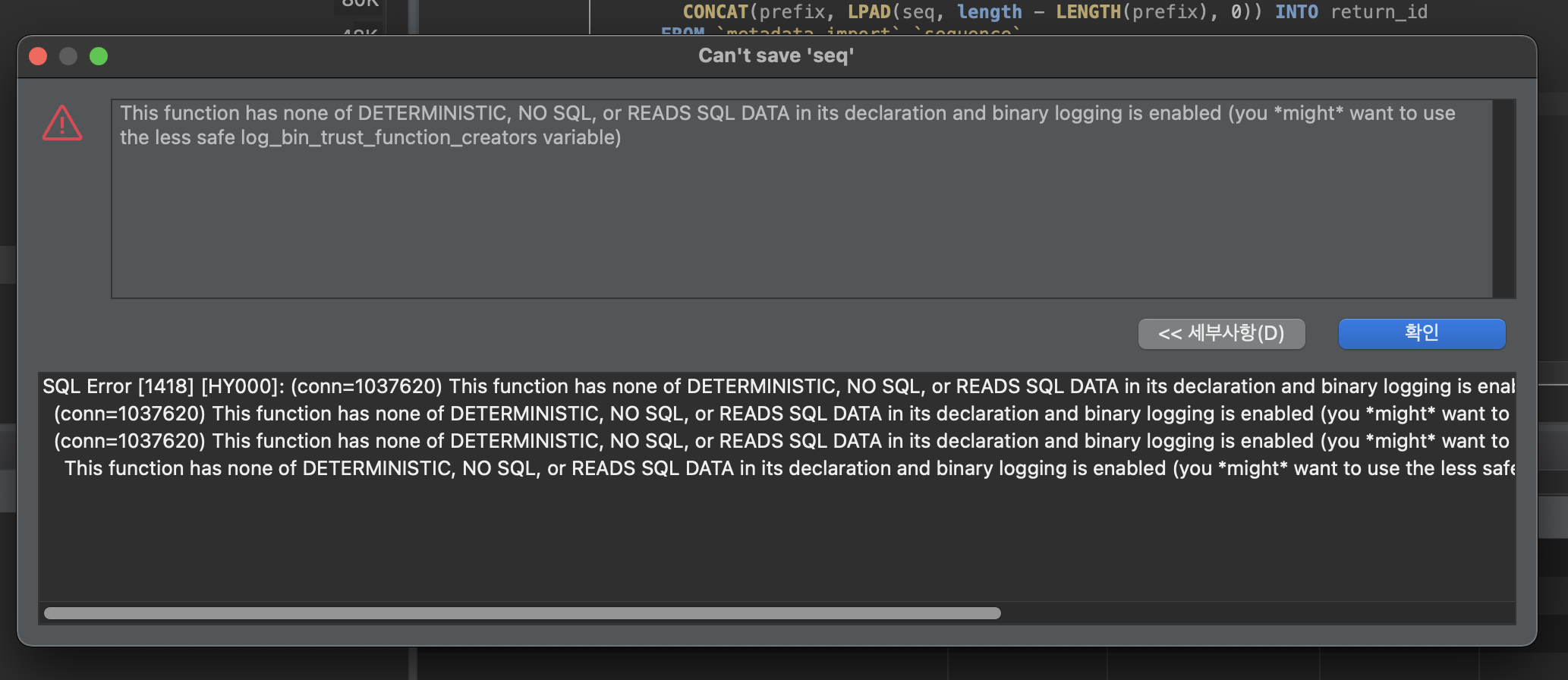 나는 설정을 풀어주기로 하였고 'log_bin_trust_function_creators' 설정이 디폴트가 0이기때문에